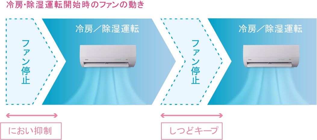 さらに、設定温度に到達し運転が安定した際にも、ファンをコントロールする「しつどキープ」機能を備えています。熱交換器に付着した水分が室内に戻るのを防ぎ、運転開始から安定時まで、快適な空気環境を維持します※2。