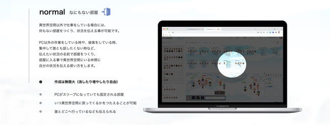異世界空間以外で仕事をしている場合には、何もない部屋をつくり、状況を伝える事が可能です。 PC以外の作業をしている時や、接客をしている時、集中して誰とも話したくない時など、伝えたい状況の名前で部屋をつくり、部屋に入る事で異世界空間にいる仲間に自分の状況を伝える使い方をします。 ・作成は無限大(消したり増やしたり自由)
