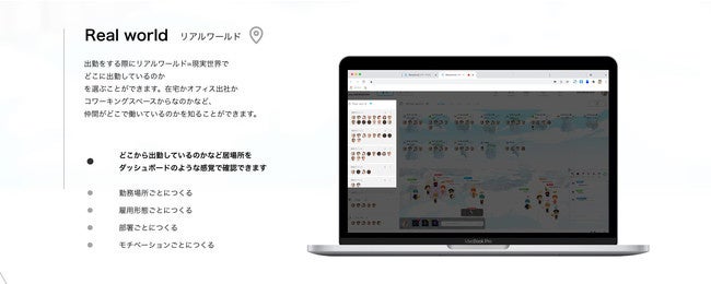 実は、ViKet town(ビケットタウン)の異世界空間では、リアルな世界では正確に取得できないすべての事柄を見える化することが可能です。 その為、勤怠管理、タイムカード、社内報、日報、位置情報、MAP作成機能、社員紹介、等、の既存機能に加えて、各組織やチームの状況に応じて、取得したい情報やアラートを設定でき、リアルなオフィス環境よりも、働く社員の健康管理が充実する機能も存在します。