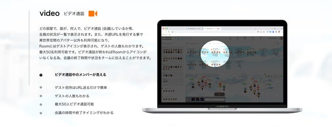 どの部屋で誰が何人のビデオ通話している姿が見えます。また、外部URLを発行する事で異世界空間のアバター以外も利用可能に。ビデオ通話が終わればRoomからアイコンがいなくなるので会議が終わったこともチームに伝えることができます。