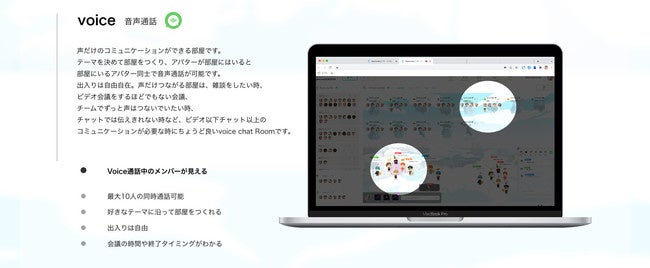 声だけのコミュニケーションができる部屋。テーマを決めて部屋をつくり、アバターが部屋にはいると部屋にいるアバター同士で音声通話が可能です。 出入りは自由自由。声だけつながる部屋は、雑談をしたい時、ビデオ会議をするほどでもない会議必、チームでずっと声はつないでいたい時、チャットでは伝えきれない時など、ビデオ以下チャット以上のコミュニケーションが必要な時にちょうど良いvoice chat Roomです。