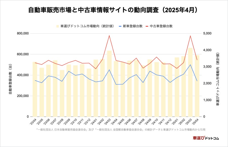 株式会社ファブリカホールディングス(本社:東京都港区、代表取締役社長CEO:谷口政人)の完全子会社、株式会社ファブリカコミュニケーションズ(本社所在地:愛知県名古屋市中区、代表取締役社⻑CEO:⾕⼝ 政⼈)が運営する中古⾞情報サイト「⾞選びドットコム(https://www.kurumaerabi.com/)」は、2025年4月の新車・中古車登録台数の推移および当サイトの販売台数推移をもとに中古車市場の動きをまとめた『中古車市場統計レポート』をご案内いたします。