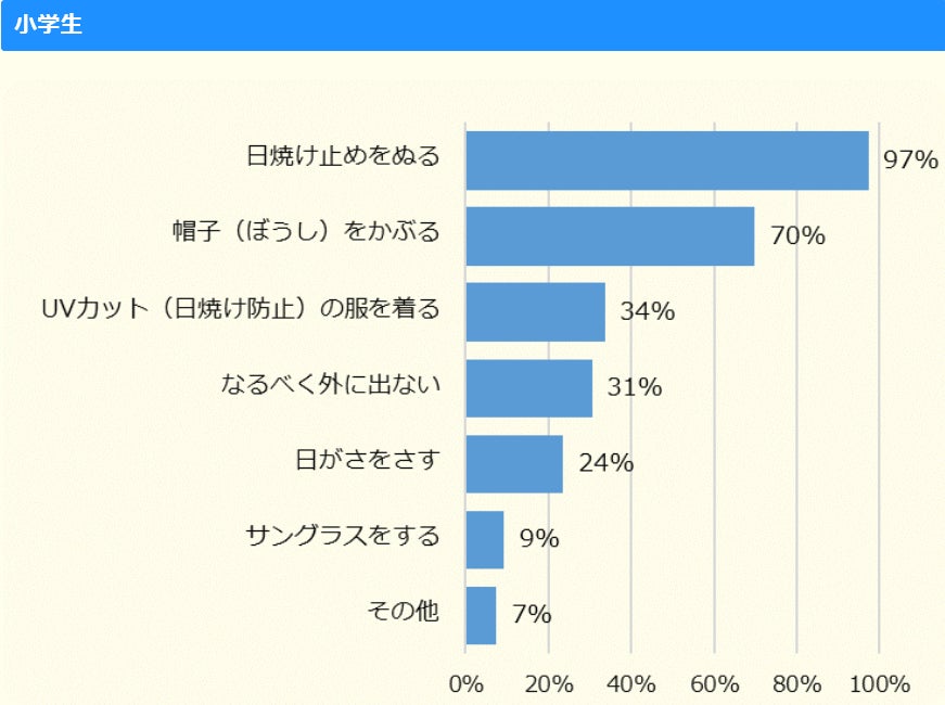 日焼け対策をしている小中学生は77%で、ほとんどの子どもたちが日焼け止めを使用して対策をしていることが分かりました。