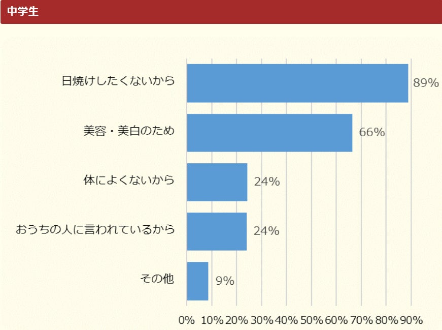 日焼け対策をする理由は、「美容・美白のため」が「日焼けしたくないから」に次いで多くなっていて小中学生のうちから美容への意識を持っている子どもたちが多いようでした。