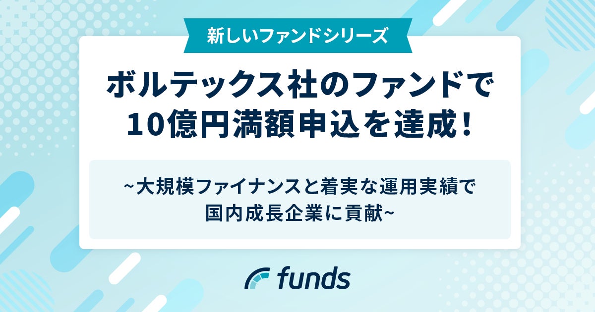 固定利回り投資の資産運用サービス「Funds(ファンズ)」を運営するファンズ株式会社(本社:東京都渋谷区、代表取締役CEO:藤田雄一郎、以下 当社)は、この度、株式会社ボルテックス(本社:東京都千代田区、代表取締役社長 兼 CEO:宮沢 文彦、以下 ボルテックス社)を借り手とするファンドで10億円の募集を行った結果、満額申込を達成したことをお知らせします。
