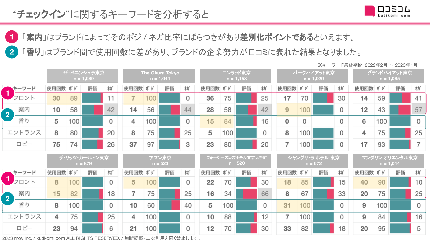 今回は、ミシュラン東京2022 5つ星ホテル10ブランド(ザ・ペニンシュラ東京 / The Okura Tokyo / コンラッド東京 他)に寄せられた約3万件の口コミを調査し、10ブランドの比較検証をしました。
