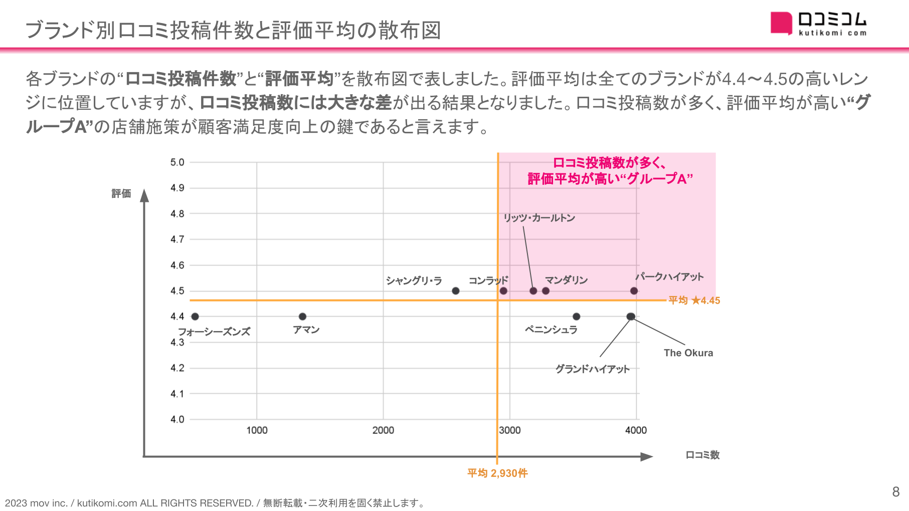 ”を散布図で表しました。評価平均は全てのブランドが4.4〜4.5の高いレンジに位置していますが、口コミ投稿数には大きな差