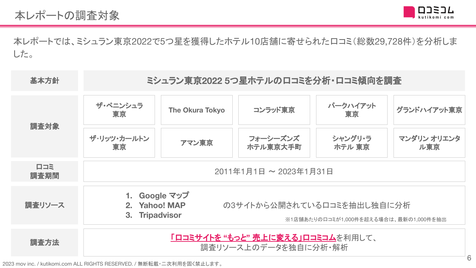 今回は、ミシュラン東京2022 5つ星ホテル(ザ・ペニンシュラ東京 / The Okura Tokyo / コンラッド東京 / パークハイアット東京 / グランドハイアット東京 / ザ・リッツ・カールトン東京 / アマン東京 / フォーシーズンズホテル東京大手町 / シャングリ・ラ ホテル 東京 / マンダリン オリエンタル東京)の口コミ(総数29,728件)を分析しました。