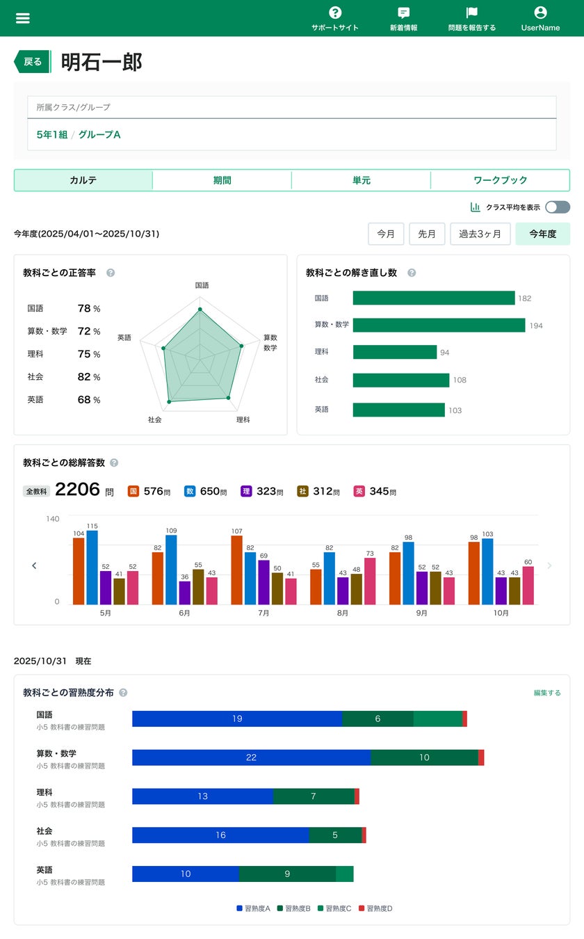 現在までの取り組み推移を示す<正答率><解き直し数><総解答数>と、画面表示時点の理解度を示す<習熟度分布>により、一人ひとりの学びの変化を俯瞰で確認することができます。