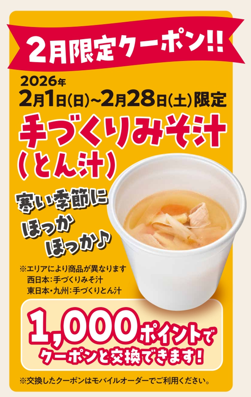2月限定!寒い季節にうれしい「手づくりみそ汁(とん汁)」クーポンも登場