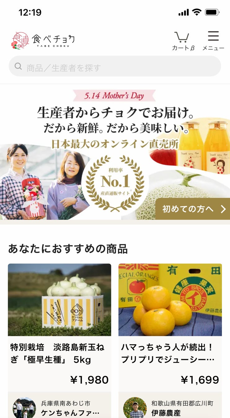お母さんだけでなく生産者さんにも感謝の気持ちを伝えたいという思いで、4月18日(火)〜5月14日(日)の期間限定で食べチョクのロゴやTOPページ、アプリアイコンを母の日デザインに変更しています。ぜひご覧ください。