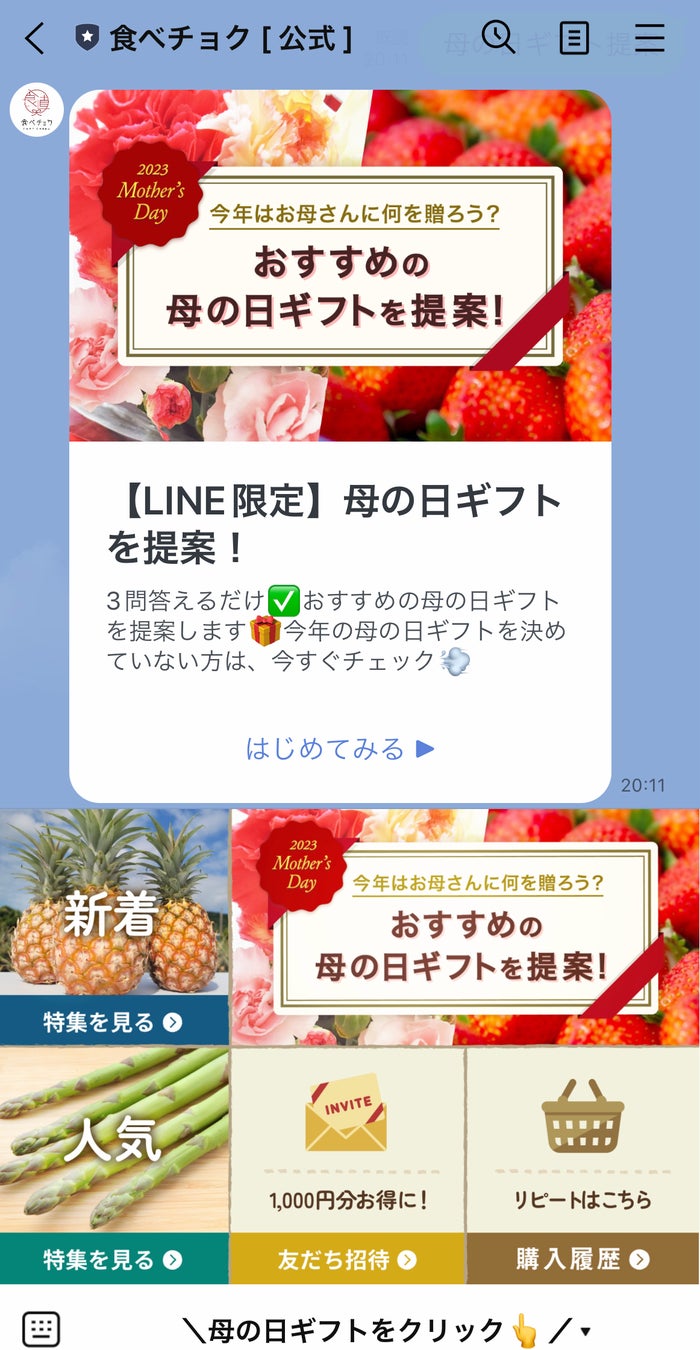 お母さんのタイプや好みから、おすすめの母の日ギフトを提案します。食べチョク公式LINEアカウントを友だち登録いただき、ギフト選びをお楽しみください。