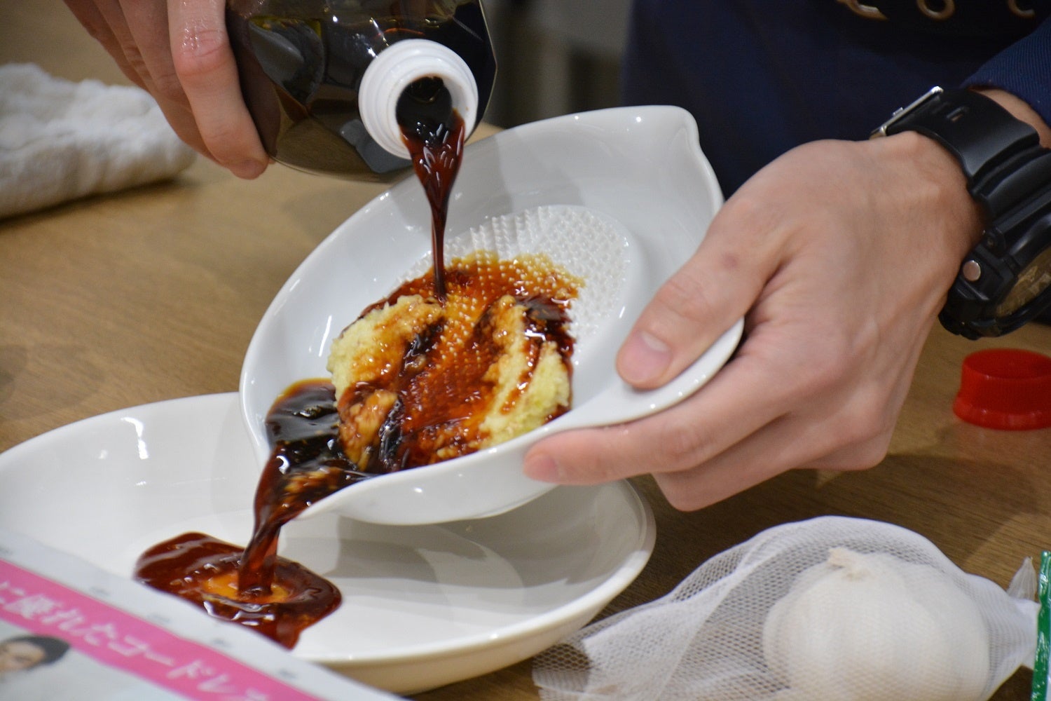 このメニューの最大のポイント、にんにく醤油作りに取り掛かり、生のにんにくをすり下ろして醤油で溶いていきます。