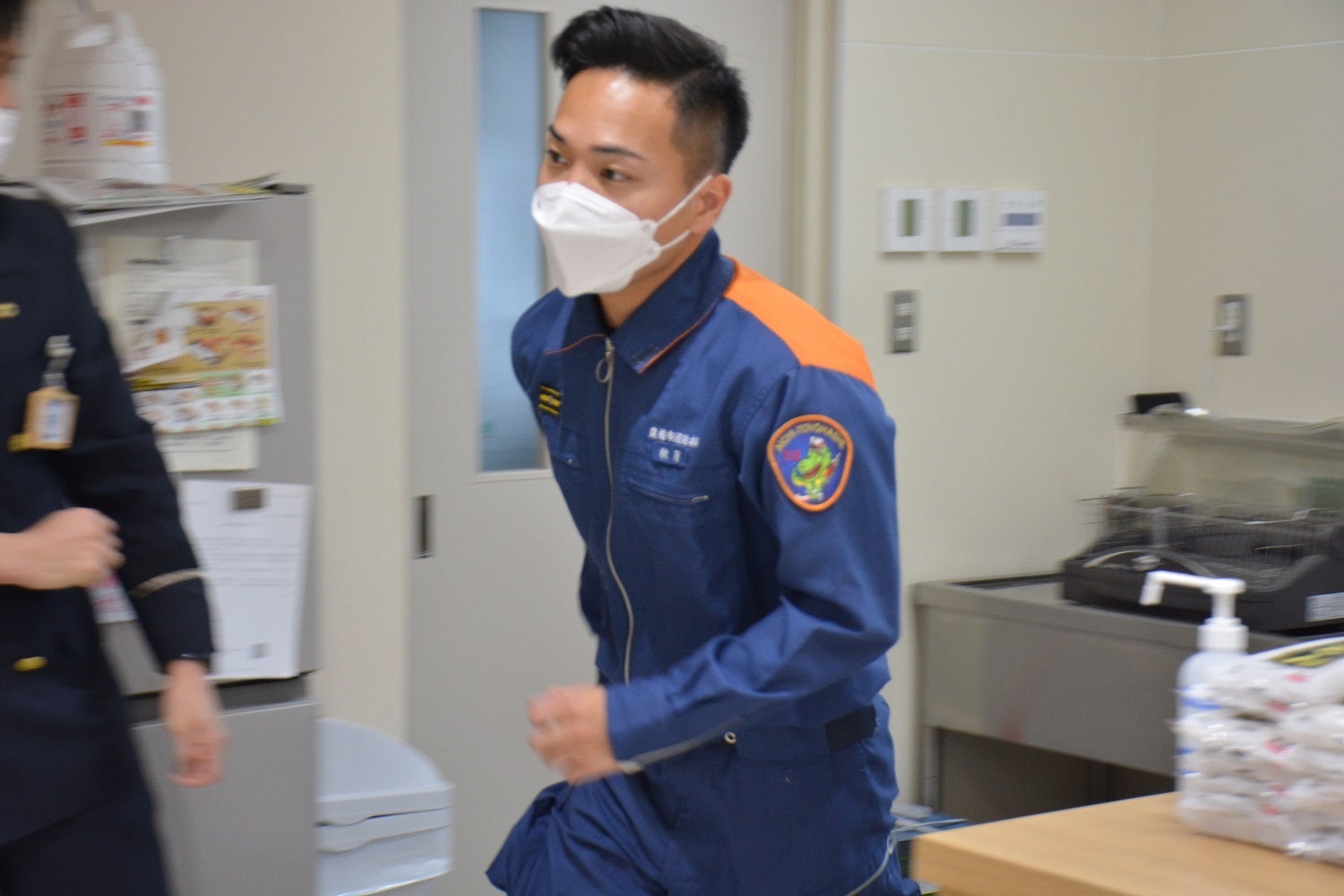 一般建物火災を想定した傷病者の救出訓練を終えたばかりの隊員がキッチンに立ちます。