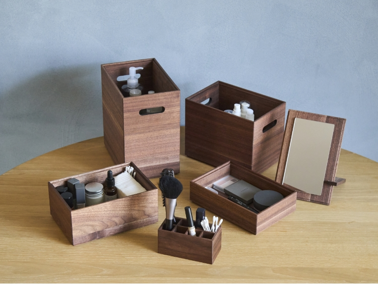 メイク道具をすっきり収納したいけど、各アイテムのサイズはバラバラで、どうもすっきり収まらない…「自分にぴったり合う収納アイテムがない」という方に向けて制作したカスタマイズできるメイクボックス「まつめ」。旭川を拠点に木工製品を手がける丹野製作所と当店で企画、デザインを、小田原の武周木工が製造を担当する、3社の協業で誕生しました。商品名の「まつめ」は「集める、纏める」に由来する言葉。お気に入りの道具を気持ちよくまとめ、収納する道具の意で名づけられました。