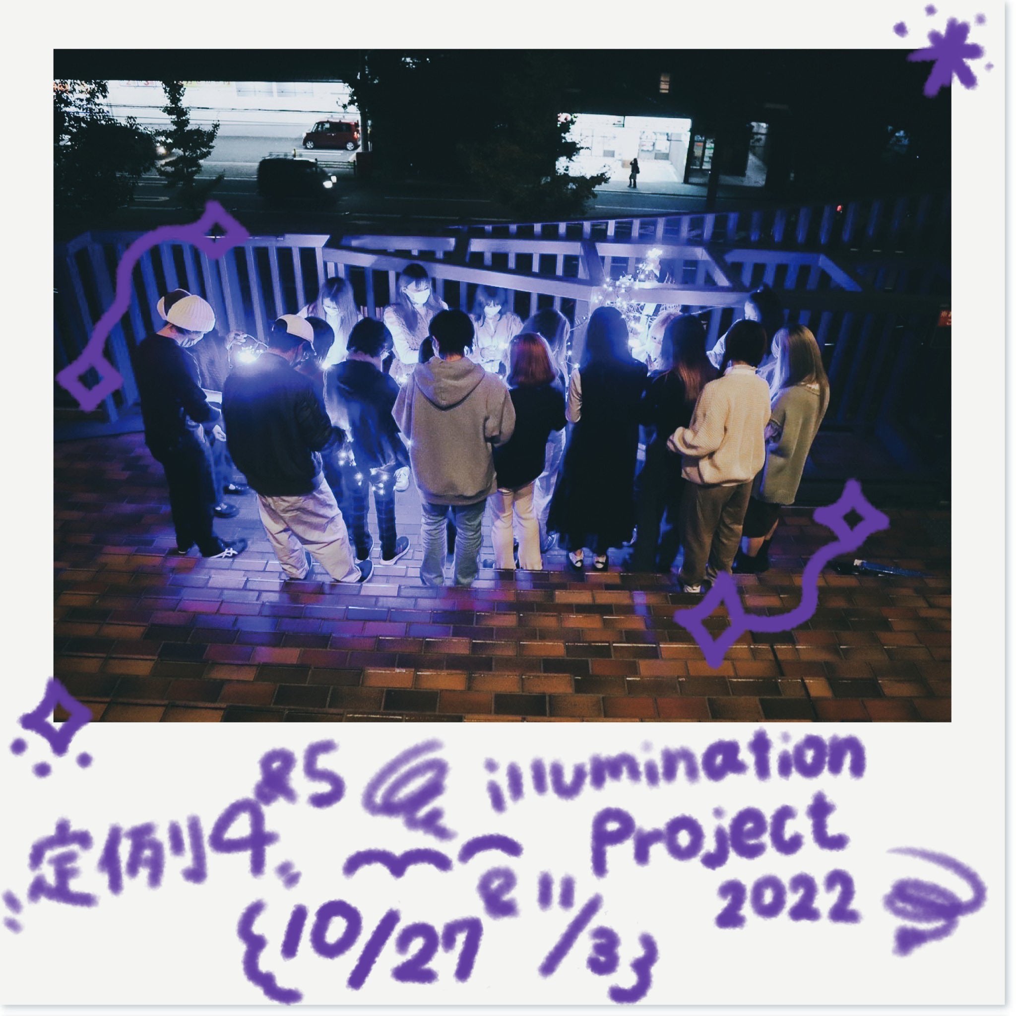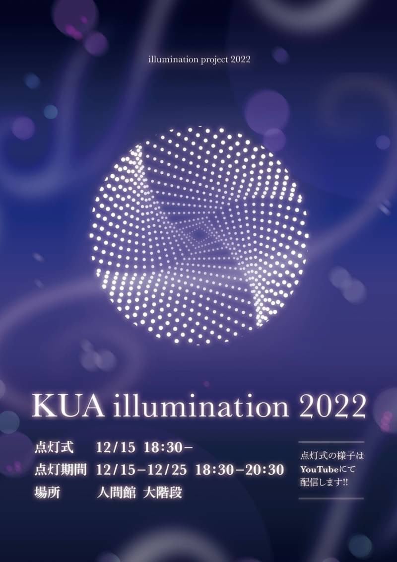 瓜生山キャンパス・人間館の大階段をイルミネーションによってアートな空間に演出し、学生や地域の方々、目の前の白川通りを行き交う方々を明るく照らし、イルミネーションを楽しんでいただくプロジェクトです。2005年から始まり、今年で16年目を迎える歴史のある社会実装プロジェクト(PBL型授業)です。