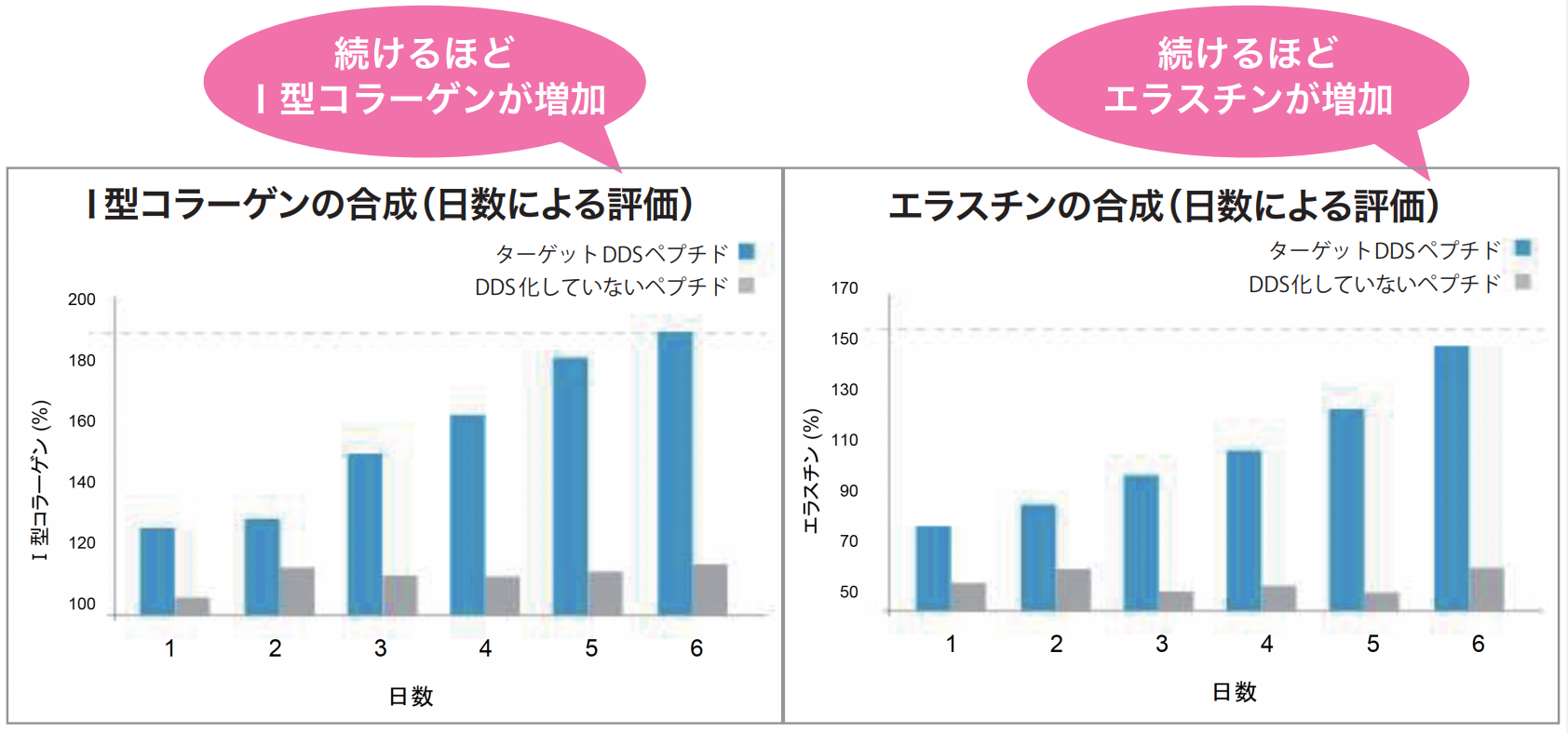 「ターゲットDDSペプチド」は、続けるほどⅠ型コラーゲンとエラスチンの合成を促進する働きが認められました。