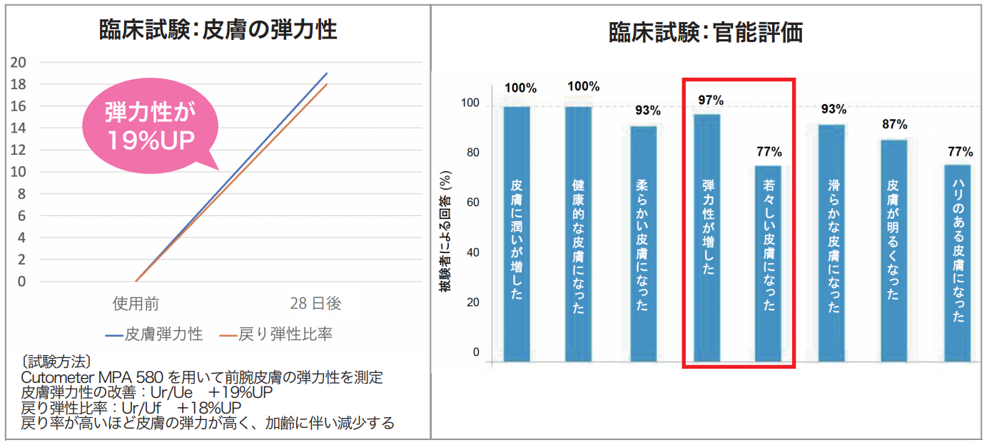 「ターゲットDDSペプチド」の使用で、28日後に肌の弾力が改善しました。被験者による官能評価のアンケートで も、97%が「弾力性が増した」と回答するなど、高評価を獲得しました。