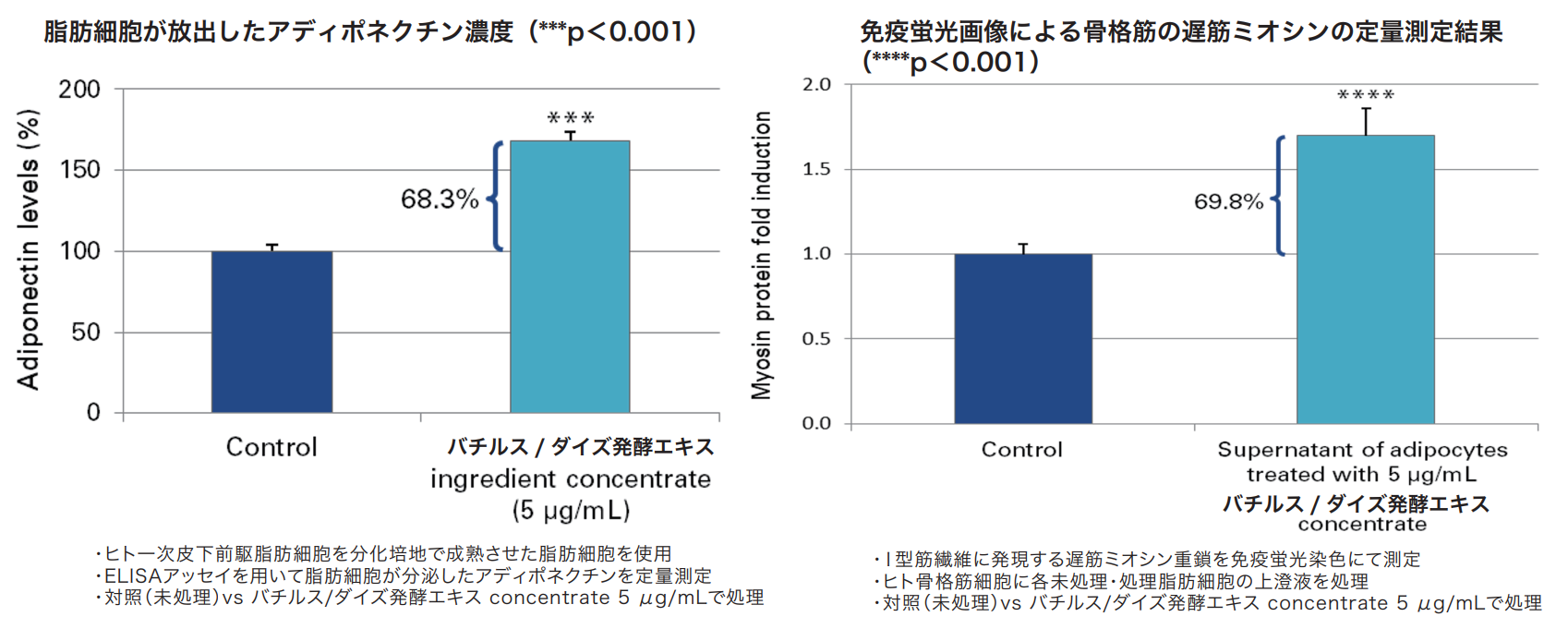 「バチルス/ダイズ発酵エキス」で、脂肪細胞のアディポネクチンの放出量が68.3%増加しました。アディポネクチンは、脂肪の分解・燃焼と筋力の増強を促進するホルモンです。また、「バチルス/ダイズ発酵エキス」で、肌のハリを支える遅筋ミオシンが69.8%増加しました。「バチルス/ダイズ発酵エキス」とは、バミューダ諸島の海洋性微生物(ヘブンリースポンジという海綿に共生するバチルス菌)が産生する糖質およびペプチド性物質由来の天然成分です。