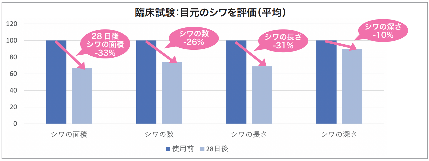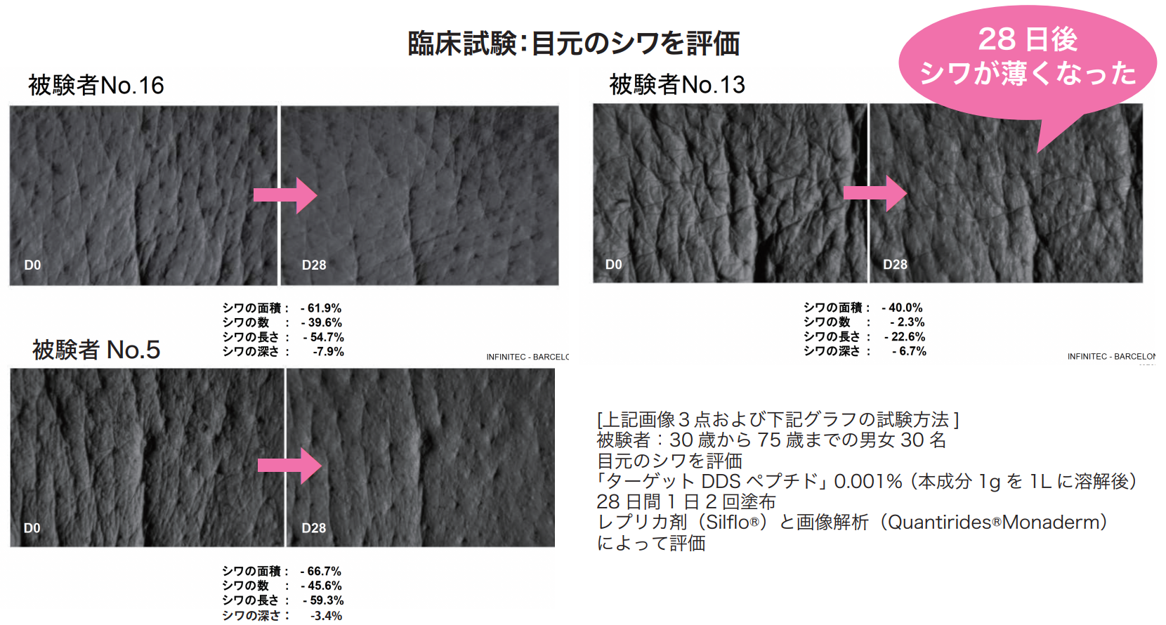 「ターゲットDDSペプチド」を使用したところ、28日で目元のシワの面積・数・長さ・深さの改善が認められました。