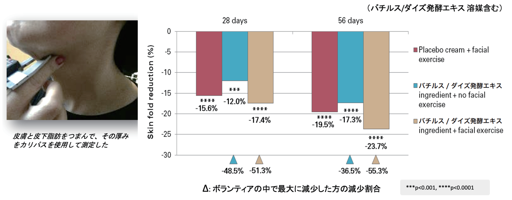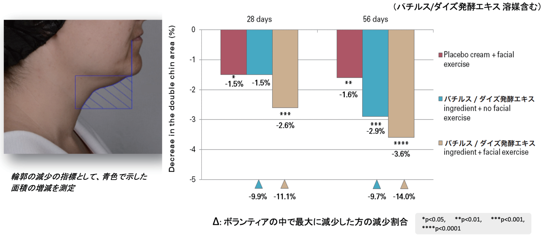 また、センチメートリック測定にて、二重あごの輪郭を測定したところ、「バチルス/ダイズ発酵エキス」の使用を開始してからわずか28日後に輪郭面積が最大9.9%減少しました。