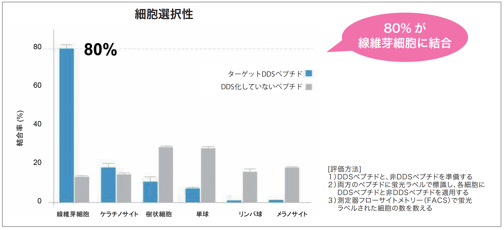 「ターゲットDDSペプチド」は80%もの高い割合で、肌のハリ・弾力を生み出す線維芽細胞に結合。DDS化してい ないものは他の部分に分散し、線維芽細胞には約15%しか届いていませんでした。DDS化したペプチドは、DDS化 していないペプチドに比べ、5倍以上も効率が良いことが確認できました。