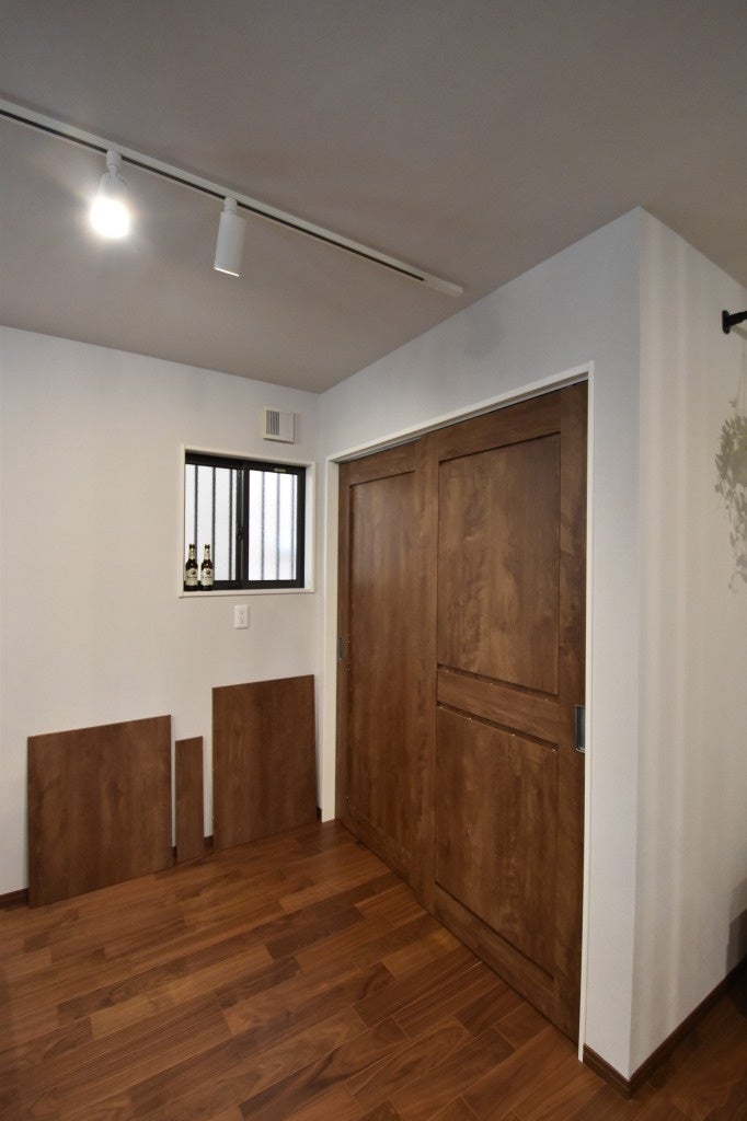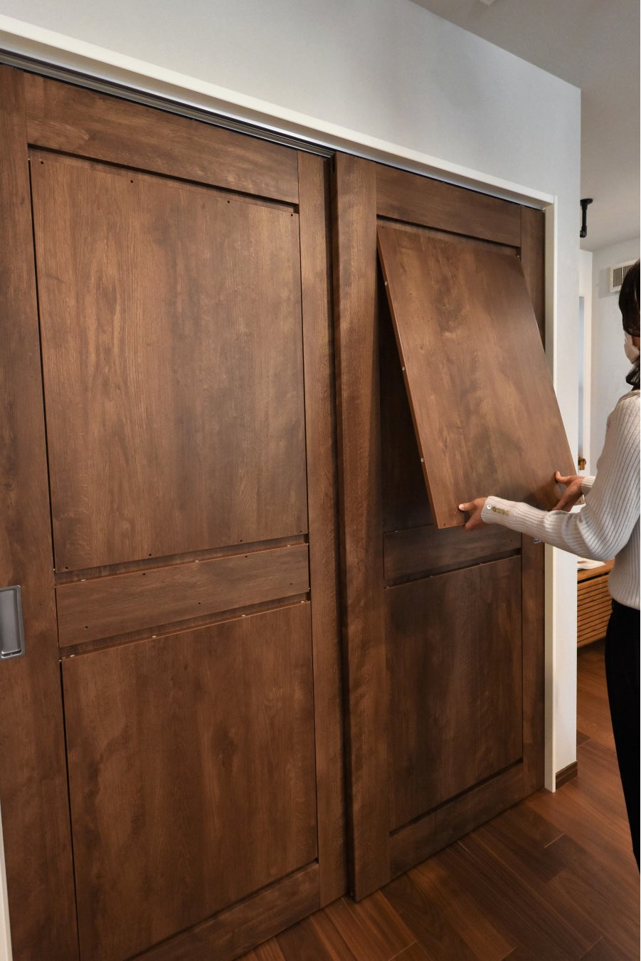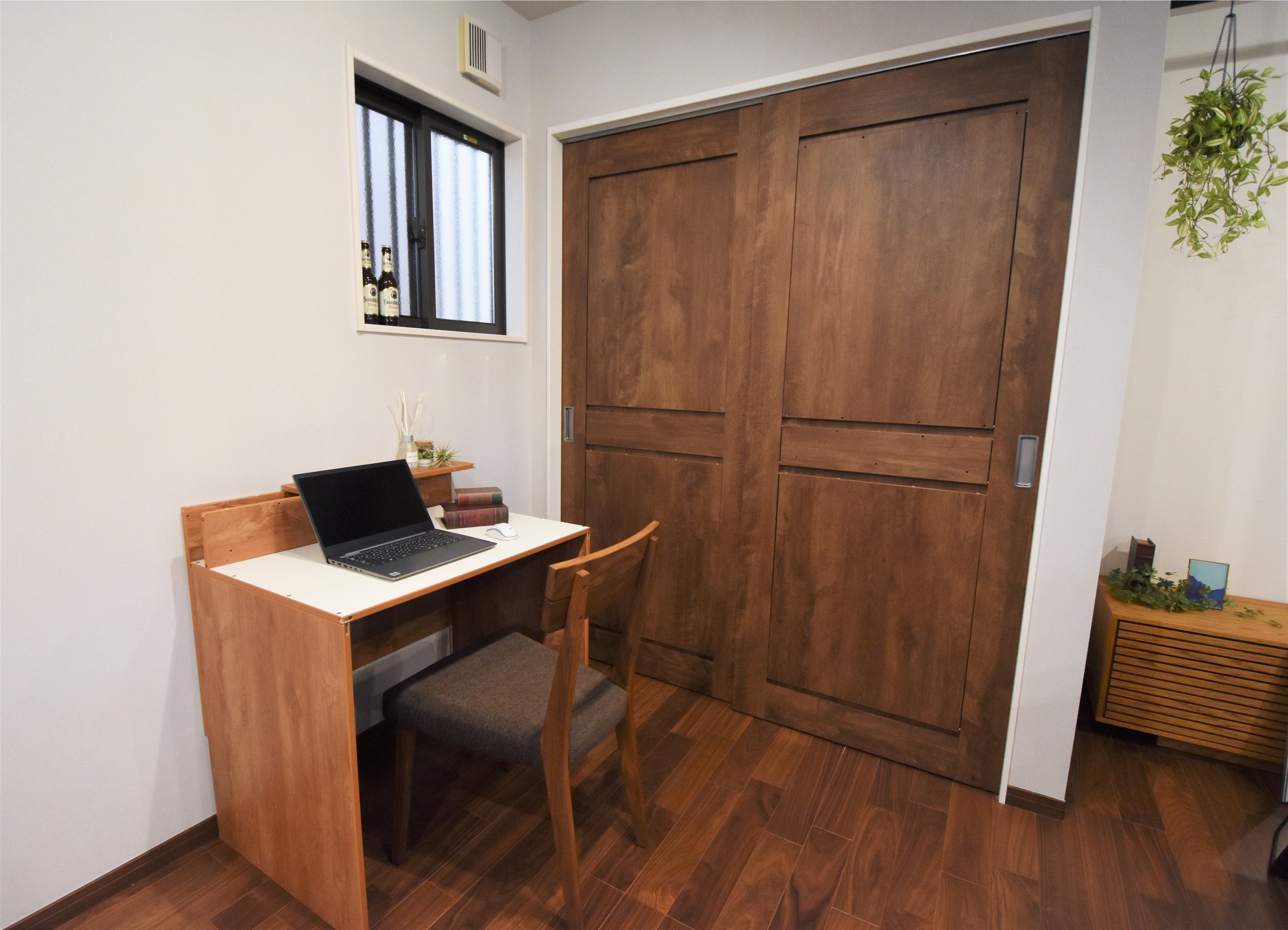 本商品は、引き違いの室内扉が二重の構造となっており、室内扉がデスクの収納場所として機能します。扉は扉の役割を持ったままに、デスクが必要な時に扉から取り外し組み立てるだけでデスクが完成し、不要になればまた扉にしまうことができます。