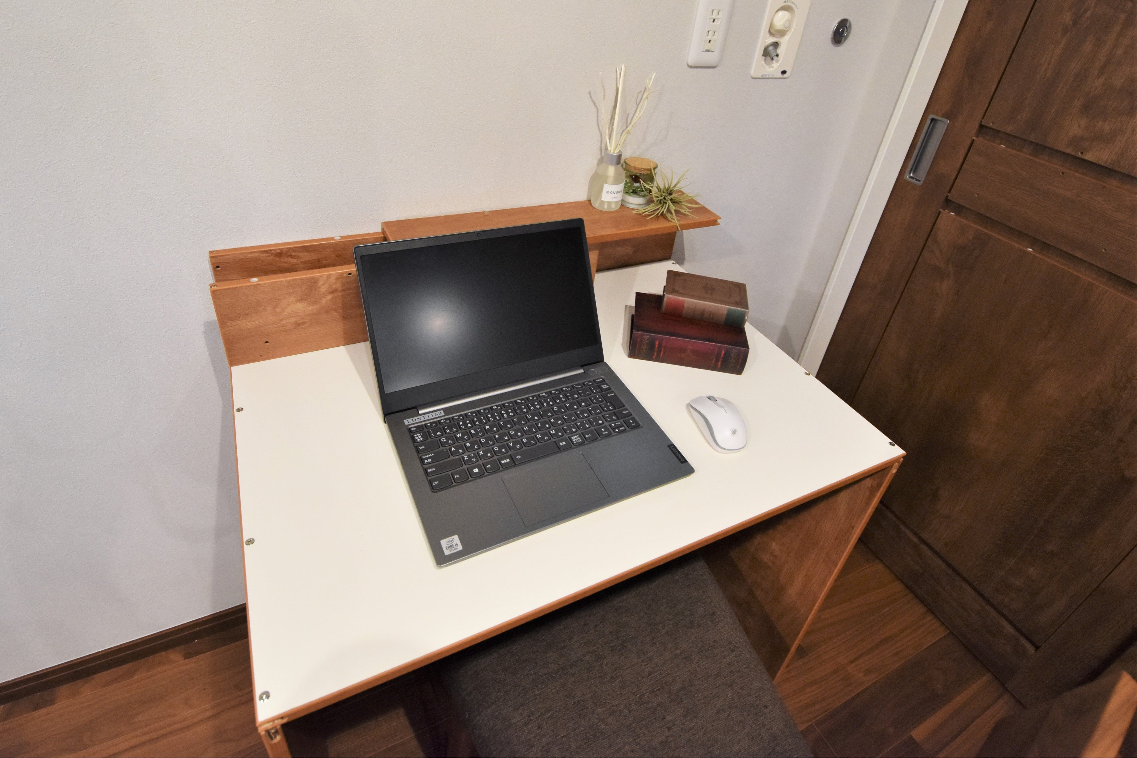 組み立て時間は一人で10分程度。主に、クローゼットなどの収納室の扉に採用することを推奨しており、デスクはワークスペースとしてはもちろん、趣味や家事のスペース、子どもの勉強デスクなどあらゆるシーンで活用していただけます。素材は、パーチクルボード(木材の小片を圧縮した木質板)使っており、どの住まいに馴染みやすい木のデザインです。