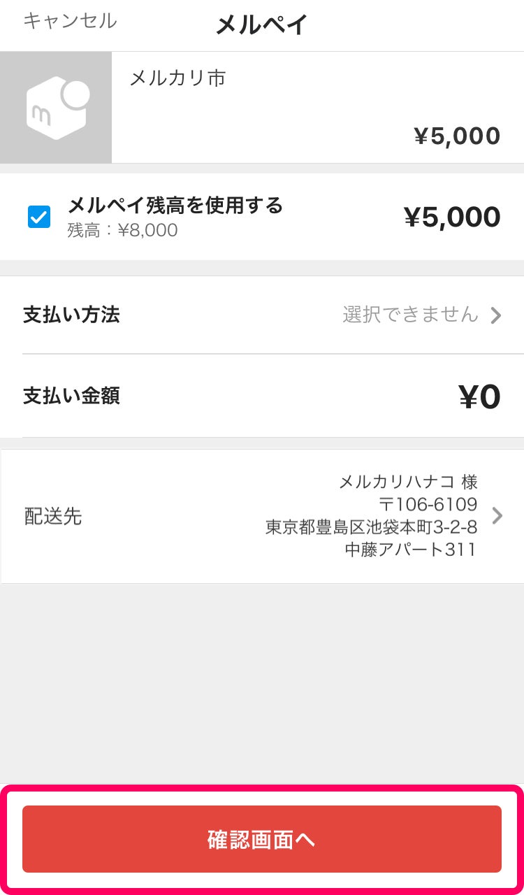 現住所と異なる情報が配送先として表示されている場合は配送先をタッチし、現住所を入力してください。