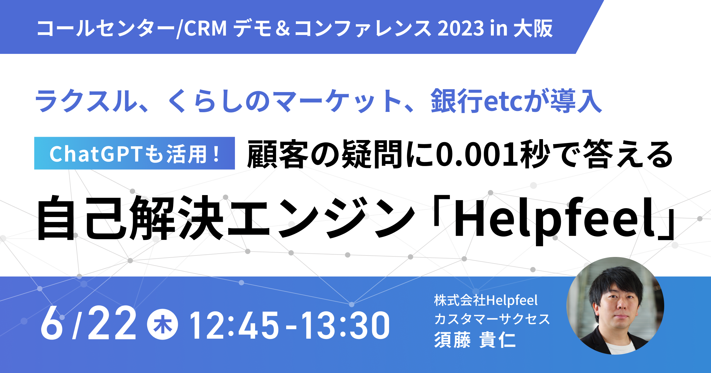 登壇テーマ:〜ラクスル、くらしのマーケット、銀行etcが導入〜ChatGPTも活用!顧客の疑問に0.001秒で答える自己解決エンジン「Helpfeel」~