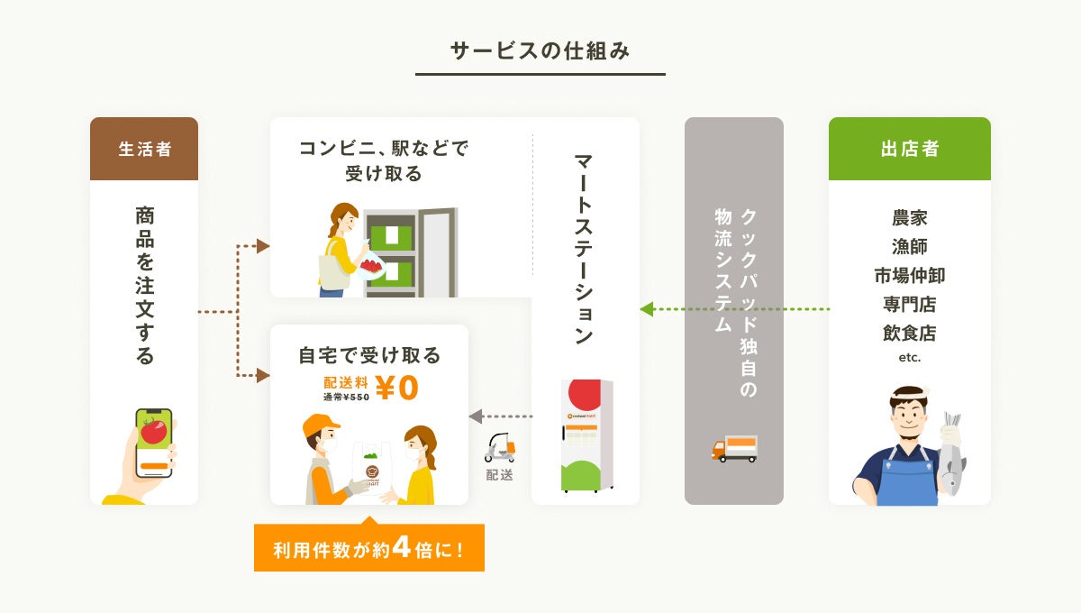 - 生鮮食品EC「クックパッドマート」は、アプリで注文した食材を1品から送料無料で「マートステーション*2」で受け取ることができるサービス