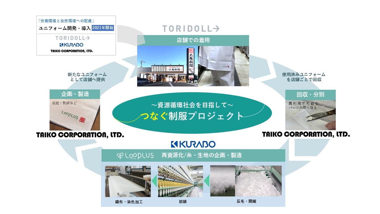 株式会社トリドールホールディングス(東京都渋谷区、代表取締役社長 兼 CEO 粟田 貴也、以下、「トリドール HD」)と、クラボウ(大阪市中央区、代表取締役社長 西垣 伸二)及び株式会社タイコーコーポレーション(大阪市中央区、代表取締役社長 原辺 任圭)は、廃棄されるユニフォームを回収・再資源化して、新たなユニフォームへとアップサイクル※1する「つなぐ制服プロジェクト」を立ち上げました。回収したユニフォームは、2021年に従業員の働きやすさと環境に配慮して3社が共同開発したもので、これを前掛けへとアップサイクルし丸亀製麺の店舗での着用を開始しております。この取り組みを通じて、循環型経済への移行を進め、環境負荷軽減などの社会課題の解決に貢献してまいります。