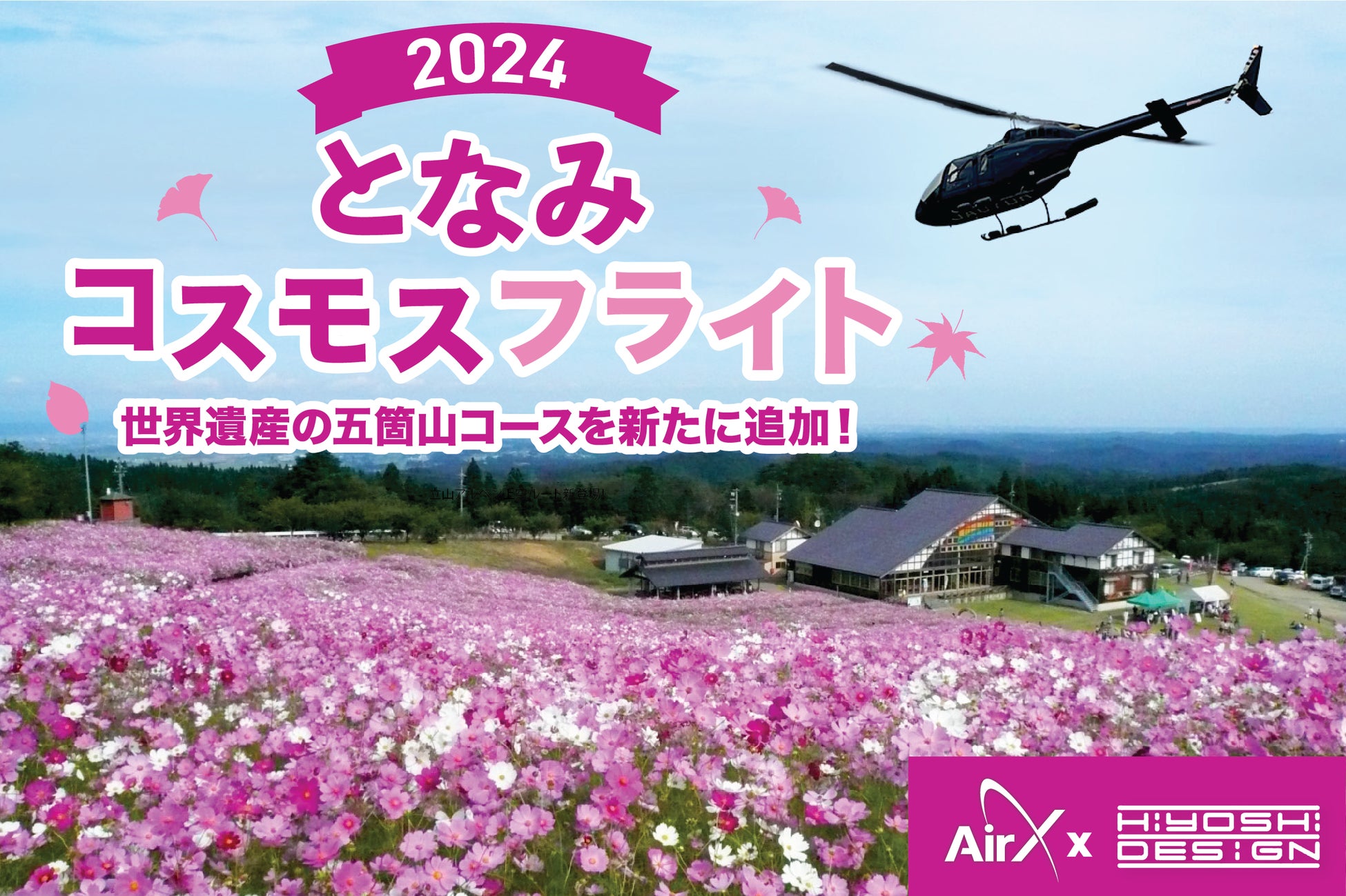 株式会社AirX(本社:東京都千代田区、代表取締役:手塚 究、以下「AirX」)は、HIYOSHI・DESIGN(所在地:富山県砺波市、代表取締役:石村 忠美、以下「HIYOSHI・DESIGN」)と連携し、10月12日(土)・13日(日)の2日間限定で、となみ夢の平コスモスウォッチング会場や立山黒部アルペンルート、世界遺産の五箇山の上空を飛行するヘリコプター遊覧を開催することをお知らせいたします。