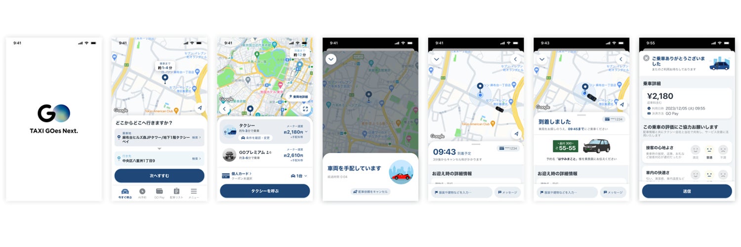 1.タクシーの配車(今すぐ呼ぶ/事前確定運賃/AI予約/複数台) 2.お支払い手段の事前登録による配車時及び車載タブレットでのGO Pay 3.電子領収書発行 ※一部機能は一部地域での提供 |