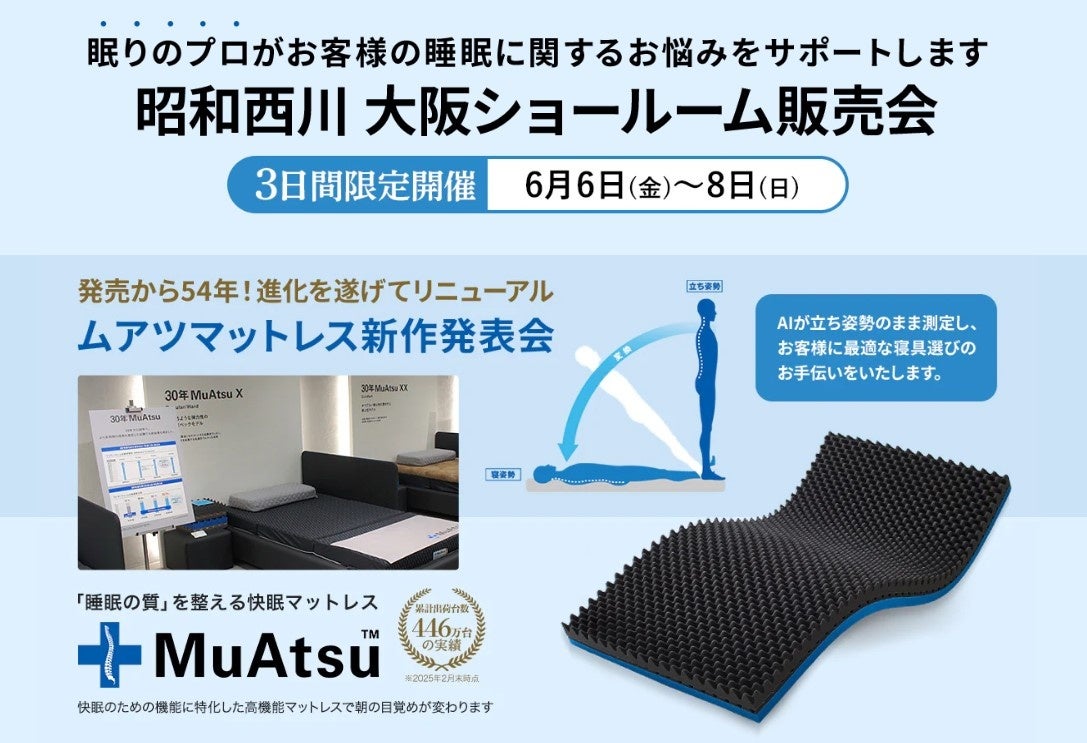 MuAtsu(ムアツ)を中心に多彩な寝具を手がける昭和西川株式会社(所在地:東京都中央区、代表:西川惠)では2025年6月6日(金)~8日(日)の3日間、大阪ショールームにて快適寝具販売会を開催いたします。