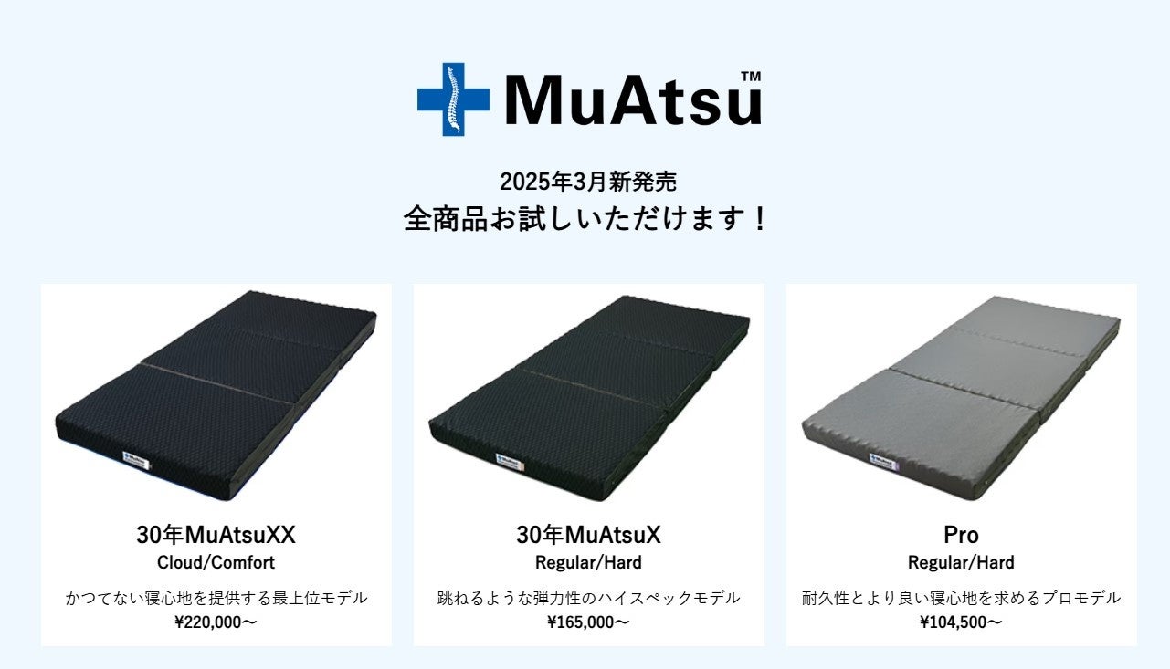 昨年12月、初の自社開催となった大阪ショールームでの販売会第一弾から、大好評につきこれまでにも度々開催され、多くのお客様から高い評価をいただいてまいりました。今回は、2025年3月に登場した注目の新モデル『30年MuAtsu(ムアツ)』をはじめ、ムアツマットレス全モデルを一堂に取りそろえております。
