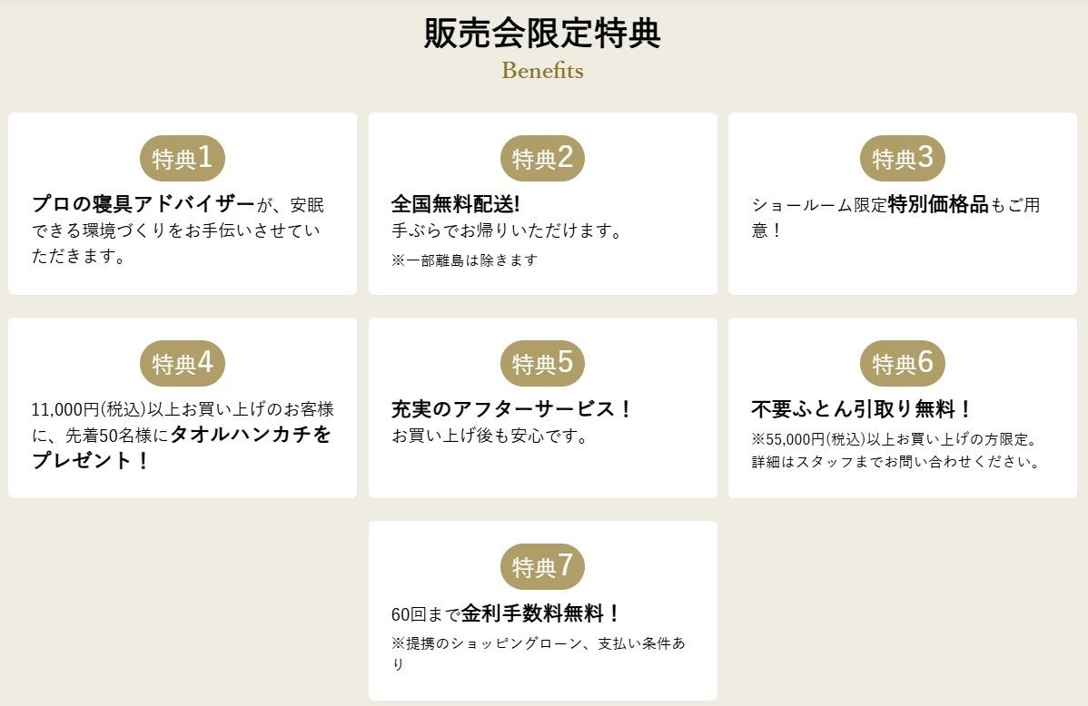 会場ではすべてのモデルを実際にお試しいただけるため、寝心地の違いをその場で比較・体感しながら、ご自身に合った1枚をお選びいただけます。快適な眠りを探している方にこそおすすめしたい、気軽にご体感いただける販売会となっておりますので、この機会にぜひお立ち寄りください。