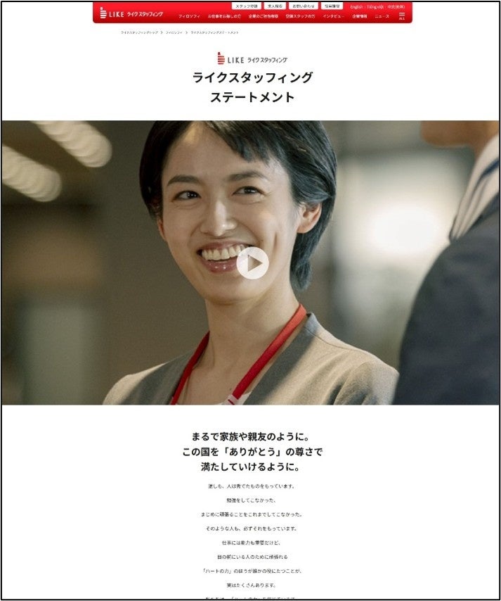保育・人材・介護の事業を展開するライク株式会社(東京本社:東京都渋谷区、代表取締役会長兼社長 グループCEO:岡本 泰彦、以下 ライク)の子会社で、総合人材サービス事業を営むライクスタッフィング株式会社(本社:東京都渋谷区、代表取締役社長:宮郷 剛士、以下 ライクスタッフィング)は、企業ステートメントに込めた想いをより多くの方に届けるため、コーポレートサイトをリニューアルいたしました。