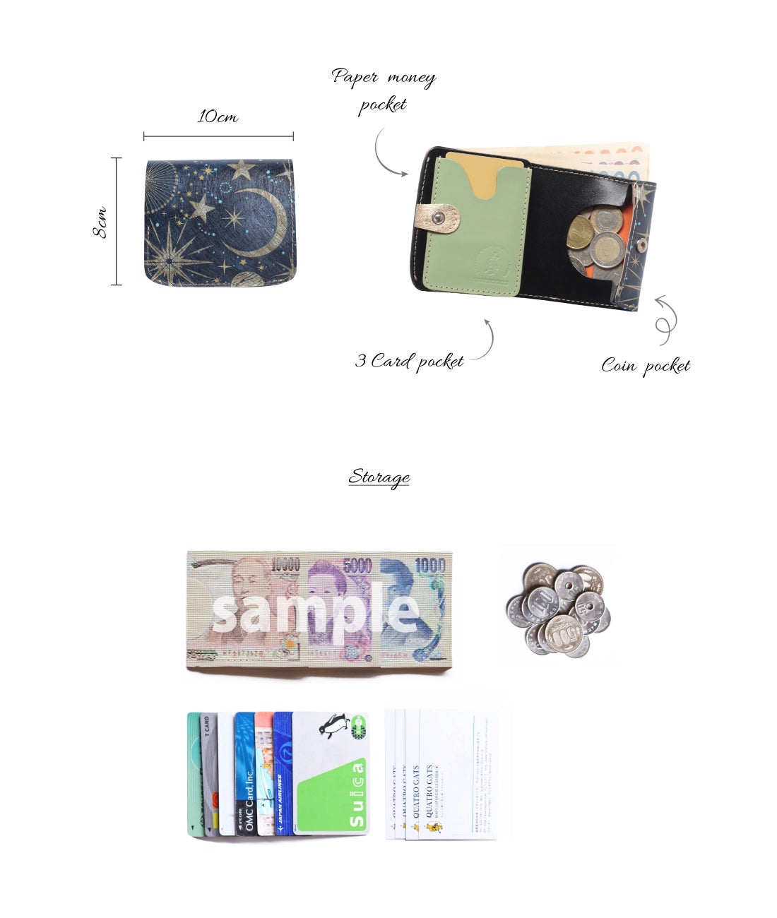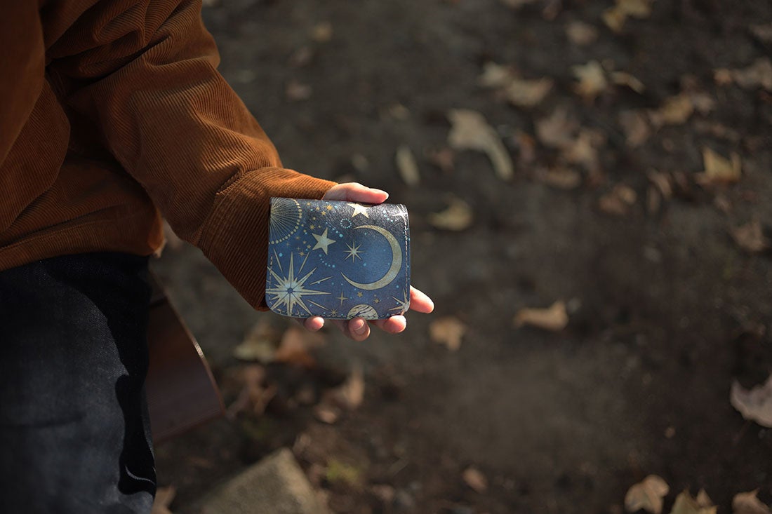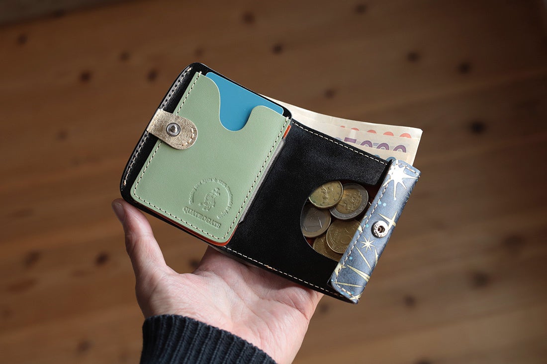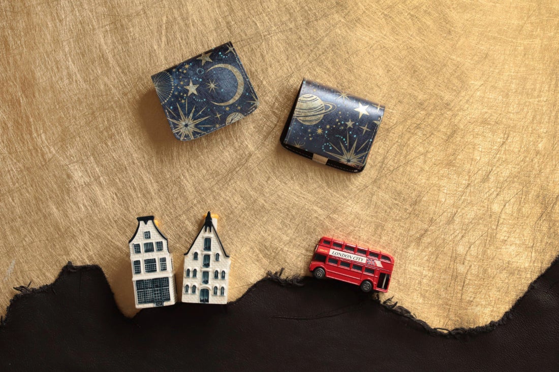 星の煌めく夜空をデザインしたミニ財布Starry Night。表にはシルバーのJAPANレザー、内側には栃木レザーを使用。