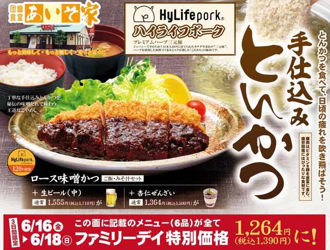 団欒食堂あいそ家は、「もっと美味しく・もっと優しく・もっと近くに」をモットーに、地域一番店を目指し取組んでおります。あいそ家ファミリーディ企画として、お父さんもお母さんもお子様も食べていただけるような対象商品3品に生ビール(中)もしくは杏仁ぜんざいをセットにした商品を税込1,390円(サンキュー価格)として提供いたします。またチラシをお持ちのお客様限定で、何回でも使える手羽先(5本)が100円引きになるお得なクーポンコードもご用意しております。