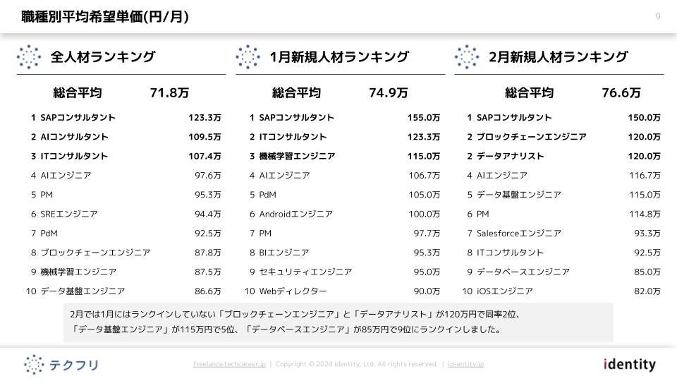 2月では1月にはランクインしていない「ブロックチェーンエンジニア」と「データアナリスト」が120万円で同率2位、「データ基盤エンジニア」が115万円で5位、「データベースエンジニア」が85万円で9位にランクインしました。