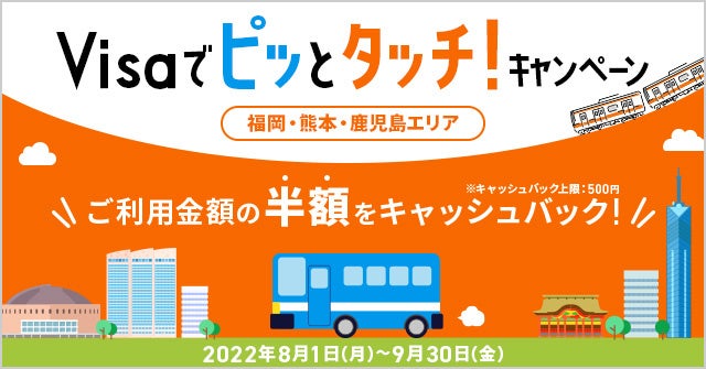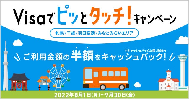 三井住友カード株式会社(本社:東京都江東区、代表取締役社長:大西 幸彦、以下:三井住友カード)は、対象の公共交通機関にてVisaのタッチ決済をご利用いただくと、もれなく半額(上限500円)キャッシュバックが受けられる「Visaでピッとタッチ!キャンペーン」を実施いたします。