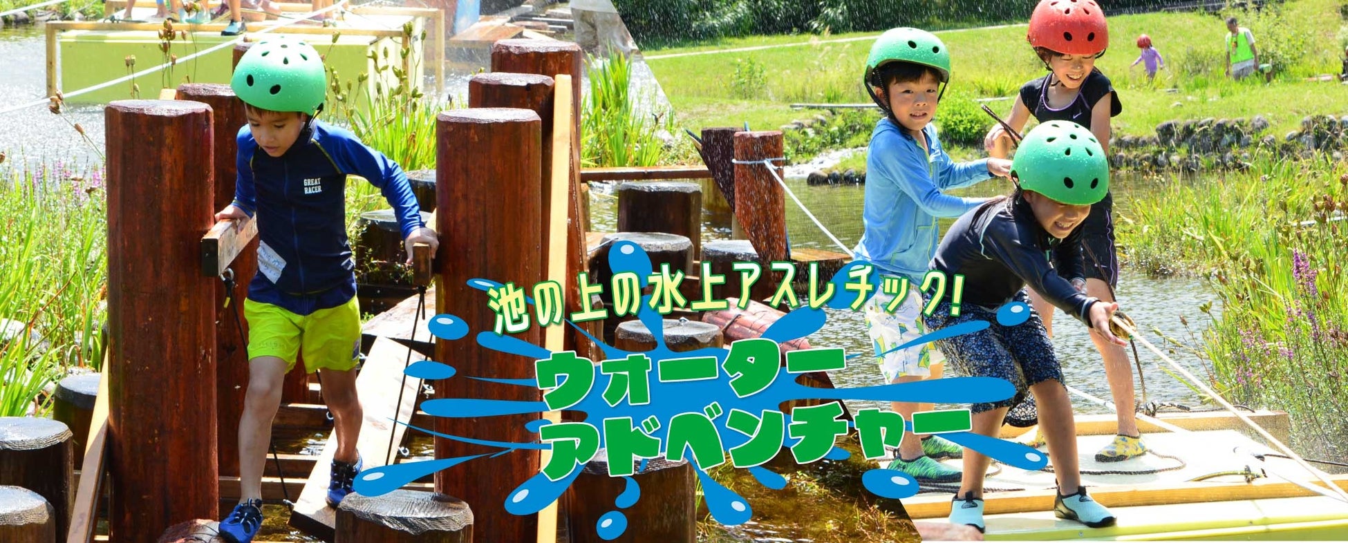 段々に広がる池を利用し、水上アスレチックを設置。水を存分に楽しめる本格アスレチックイベントを実施。