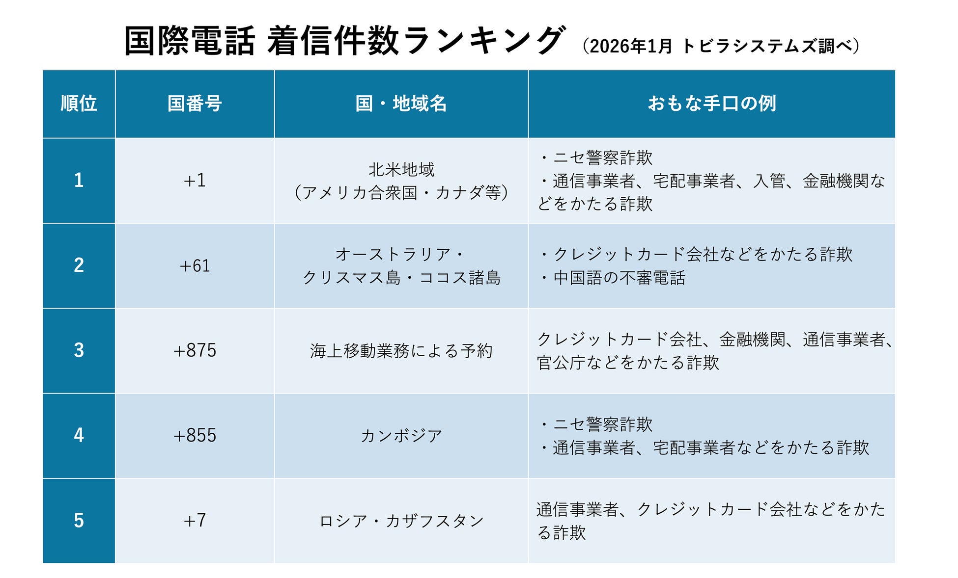 当社の調査で、2026年1月に着信件数が多かった国際電話の国番号は、上位からアメリカ合衆国やカナダなどの北米地域、オーストラリア・クリスマス島・ココス諸島、海上移動業務による予約(注1)、カンボジア、ロシア・カザフスタンでした。