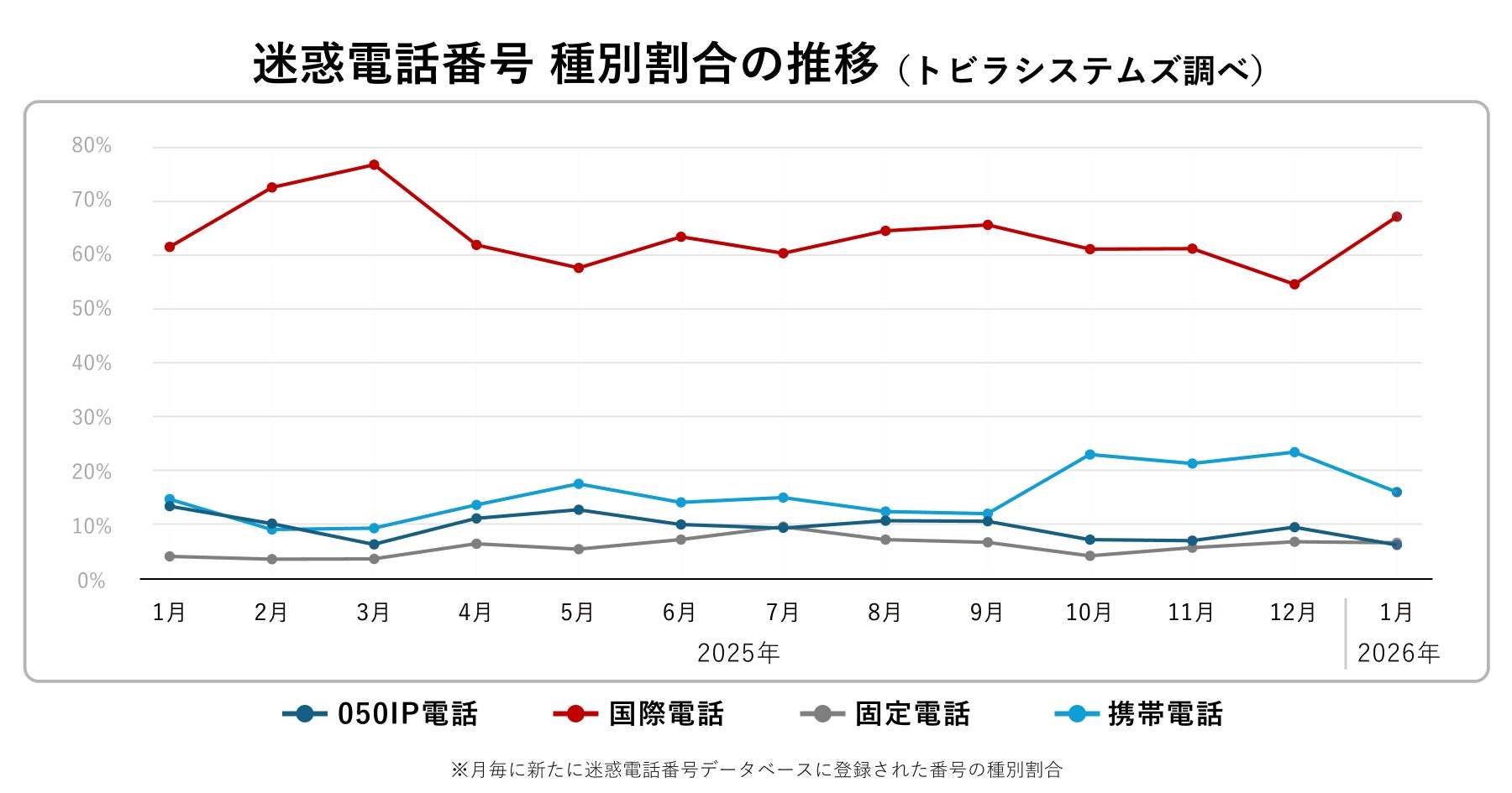 2026年1月に新たにトビラシステムズの迷惑電話番号データベースに登録された番号の種別割合は、携帯電話番号が16.1%(前月比−7.4%)で前月より減少しました。一方で、国際電話番号は前月から増加し、67.2%(前月比+12.6%)となりました。