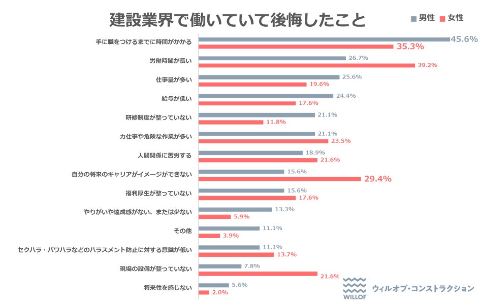 また、【建設業界で働いていて後悔したこと】(複数回答)についても聞いたところ、「手に職を付けるまでに時間がかかる」と回答した割合が男性で46.0%、女性で35.0%となりました。手に職を付けられることに魅力を感じる一方で、実際に手に職を付けるまでが大変だと実感している人も多いことがわかりました。