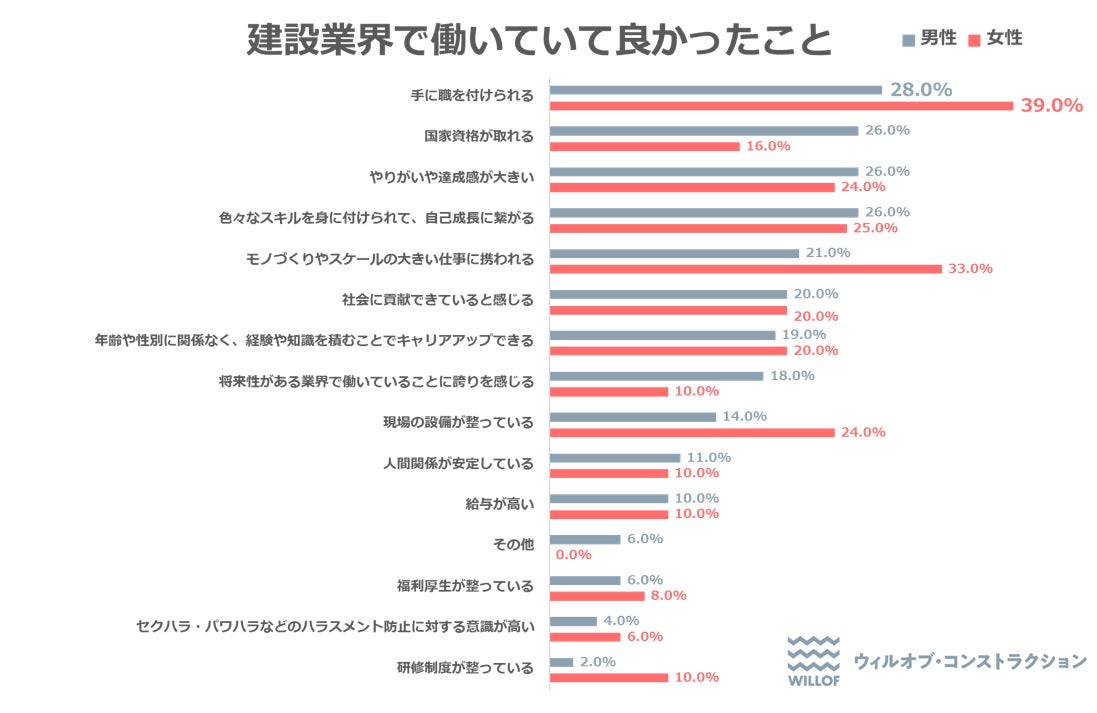 次に、【建設業界で働いていて良かったこと】(複数回答)を聞いたところ、「手に職を付けられる」と答えた割合が男女ともにトップ(男性28.0%/女性39.0%)でした。前問の「建設業界に入ろうと思ったきっかけ」として最も多かった回答も「手に職を付けたいから」であったことから、入社前に思い描いていたことを入社後に実現することができた、と感じている若手社員が多いことがわかりました。