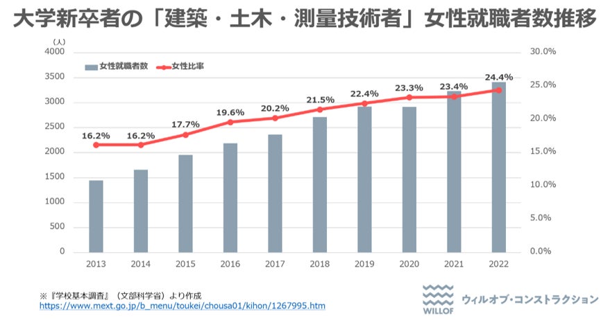 総務省が2023年1月に発表した「労働力調査」によると、2022年の建設業の就業者数は479万人と、2018年の503万人から4年連続で減少しており、人手不足が深刻な業界ですが、一方で建設技術者として就職した大学新卒者は年々増加傾向となっています。