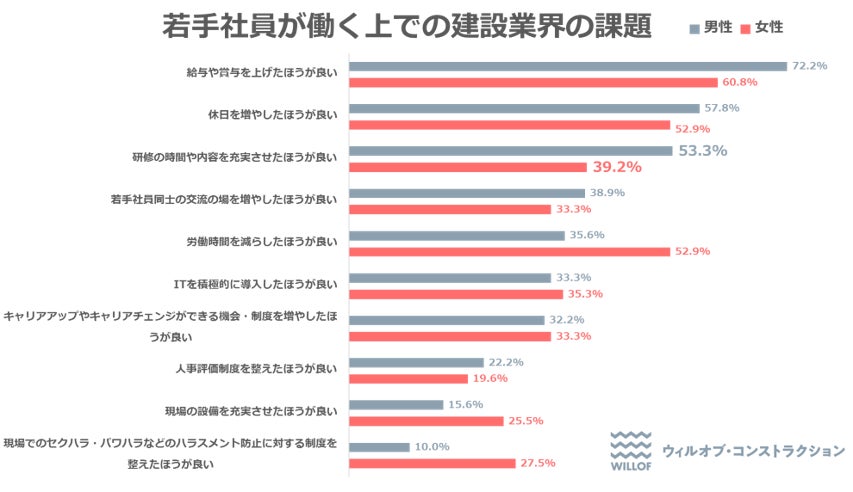 最後に、【若手社員が働く上での建設業界の課題】(複数回答)について聞いたところ、男女ともに「給与や賞与を上げたほうが良い」「休日を増やしたほうが良い」という条件面での改善を望む声に次いで、男性では3番目、女性では4番目に「研修の時間や内容を充実させたほうが良い」という回答が高くなりました。「手に職を付けたい」と建設業界で働くことの魅力を感じて入社する若手が多いものの、専門性が高くスキルを取得するまでには時間を要するため、現場での教育・育成体制を充実させることが重要であると感じている若者が多いことが分かりました。