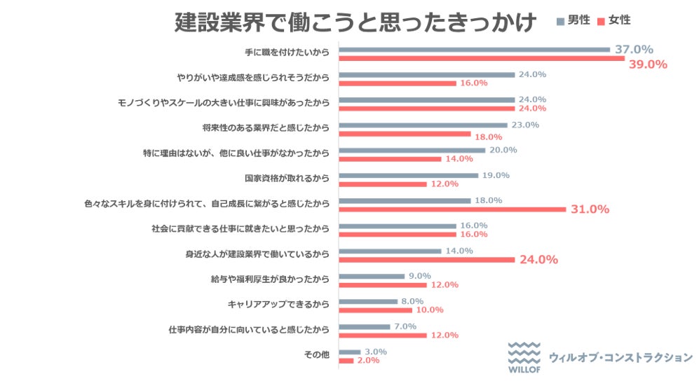 建設業界で働きたいと思ったきっかけは、「手に職を付けたい」が男女ともに約4割でトップ